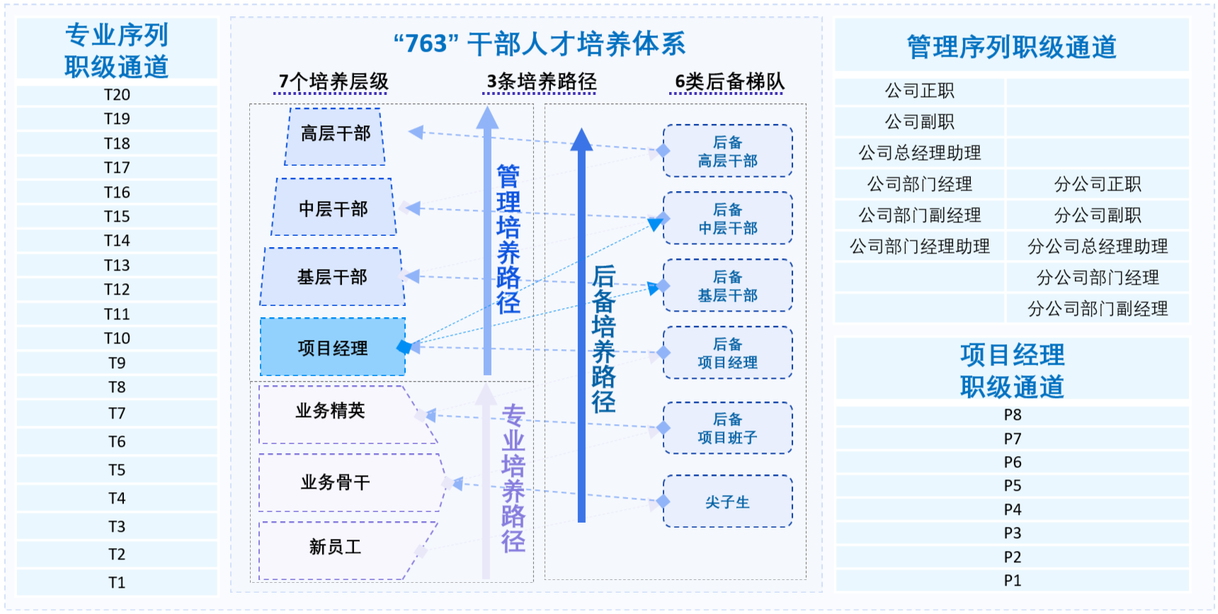 职业发展:以专业序列、管理序列并行的双通道为基础,搭建公平公正的员工职业发展平台,提供1200余个项目经理以上管理岗位,通过科学的考核、评价和晋升机制,为员工带来充足、公平、多样的职业发展机会。打造“763”干部人才培养体系,设置7个培养层级、6类后备梯队、3条培养路径,建立从新员工到高层干部循序渐进、分层分类的人才选育机制,打造壹站式知识管理系统,成立企业培训管理学院,聚集优质资源,倾力建设系统化、智能化的员工能力提升平台,助力员工快速成长。